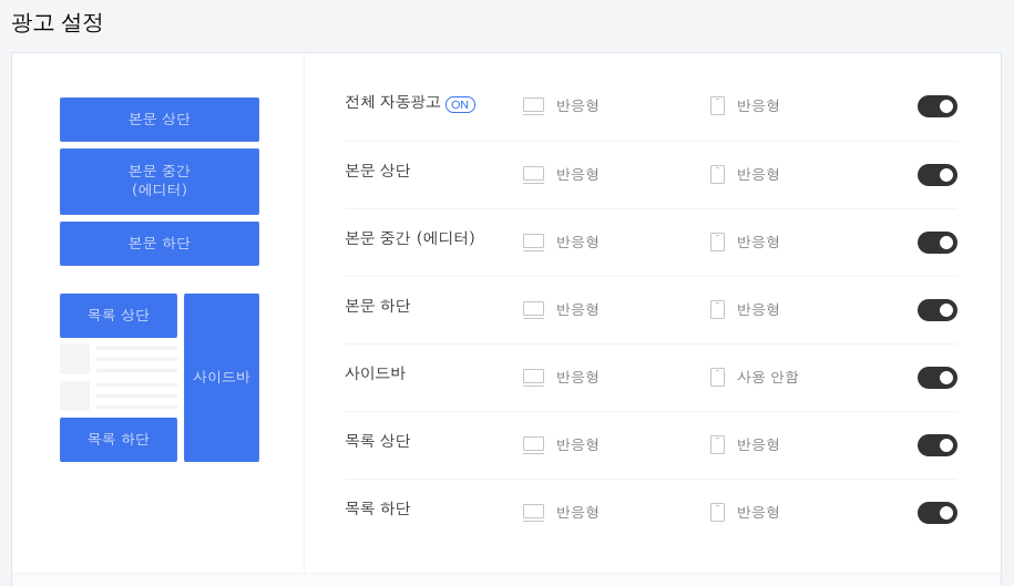 [광고설정]을 보시면 본문 상단 부터 사이드바 까지 내 스킨의 다양한 영역에 광고를 표시 할 수 있습니다.