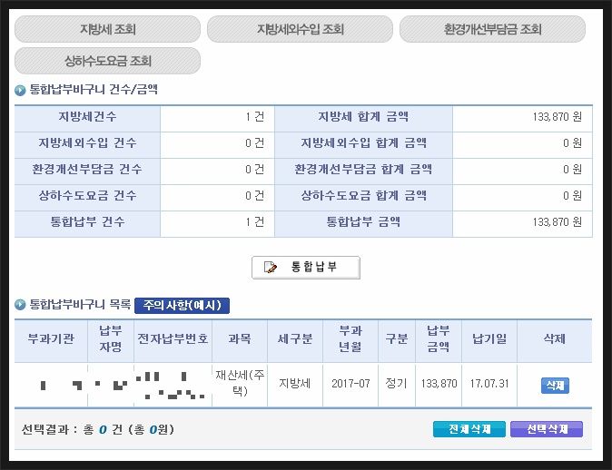 통합납부바구니 목록을 확인 후 통합납부를 클릭해 주세요.